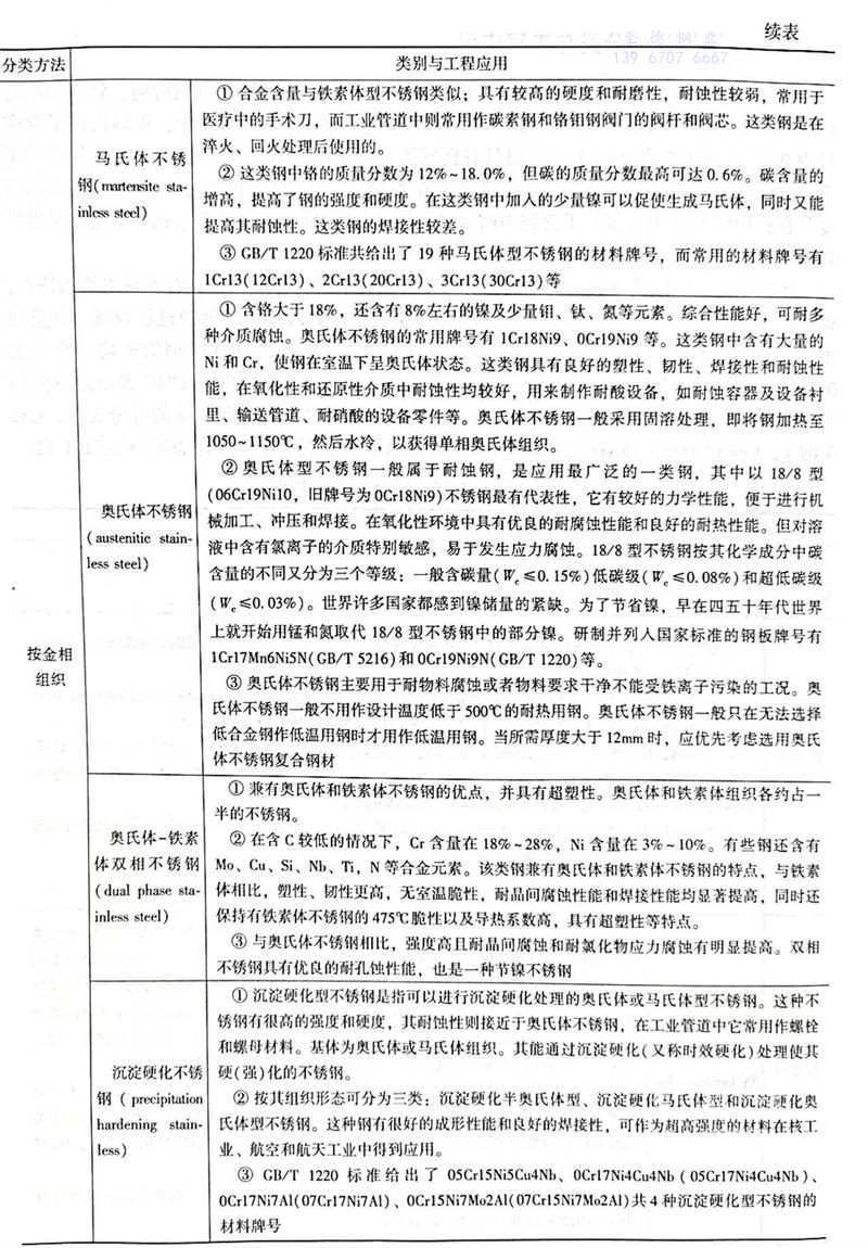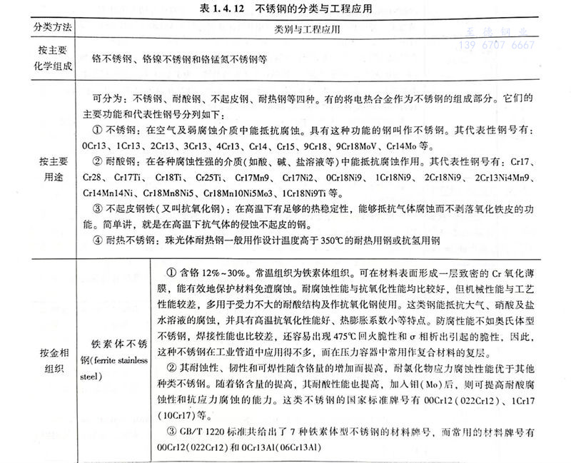 不銹鋼是一種以鐵和碳為基礎的含有較多合金元素的高合金鋼,具有不易生銹的特點,但是,不是絕對的不生銹,而是生銹量、被腐蝕量少,生銹和被腐蝕的過程較慢,甚至根本不能察覺。不銹(xiu)鋼鋼號中碳含量以千分之幾表示。例如“1Cr13”鋼的平均碳含量為0.1%;若鋼中含碳量≤0.03%或≤0.08%者,鋼號前分別冠以“00”及“0”表示之,例如0Cr18Ni9(06Cr19Ni10)為不銹(xiu)鋼牌號,牌號表示鋼材中的主要合金元素的百分含量,C≤0.08%,Cr=17.00%~19.%~19.00%,Ni=8.00%~11.00%。不銹鋼的分類與工程應用見表1.4.12。