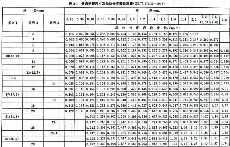 普(pu)通鋼管(guan)尺寸及單位長度(du)的理論(lun)質量見表3-1。