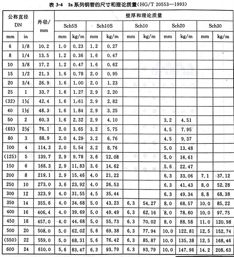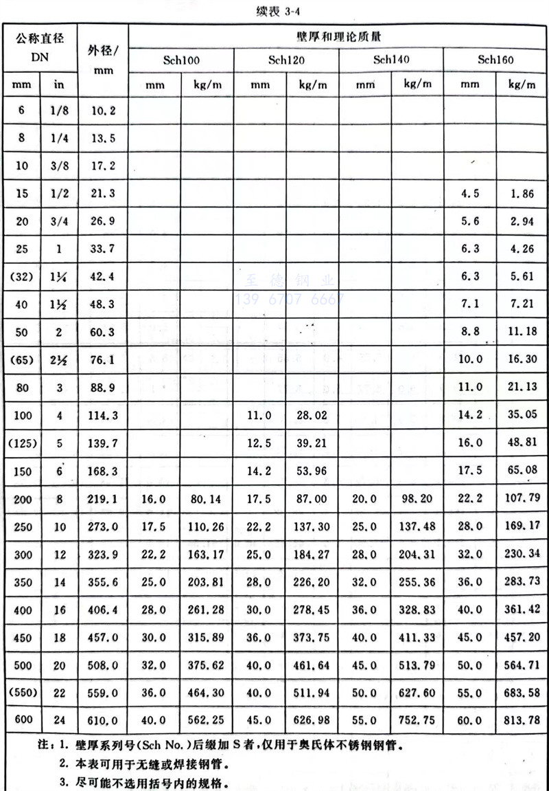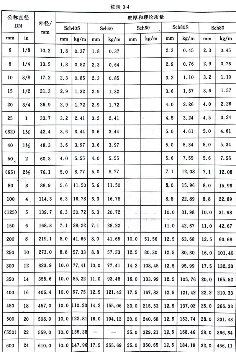 表(biao)3-4中(zhong),鋼(gang)(gang)管(guan)外徑等效(xiao)采(cai)用(yong)(yong)ISO 4200《焊接和(he)無縫(feng)平端鋼(gang)(gang)管(guan)尺寸(cun)與單位(wei)長(chang)度質(zhi)量總表(biao)》中(zhong)的(de)(de)尺寸(cun);壁(bi)(bi)(bi)厚(hou)(hou)(hou)采(cai)用(yong)(yong)“壁(bi)(bi)(bi)厚(hou)(hou)(hou)系(xi)列(lie)號”(英文為 Schedule Number,簡寫為Sch No.)表(biao)示(shi),壁(bi)(bi)(bi)厚(hou)(hou)(hou)值基(ji)本上采(cai)用(yong)(yong)ANSI B36.10《焊接和(he)無縫(feng)的(de)(de)軋制(zhi)鋼(gang)(gang)管(guan)》加以圓整,然后取 ISO 221《鋼(gang)(gang)管(guan)壁(bi)(bi)(bi)厚(hou)(hou)(hou)》中(zhong)相近(jin)的(de)(de)壁(bi)(bi)(bi)厚(hou)(hou)(hou)值。“Sch No.”是(shi)美國(guo)管(guan)壁(bi)(bi)(bi)厚(hou)(hou)(hou)的(de)(de)一種表(biao)示(shi)方法,它并不代(dai)表(biao)管(guan)壁(bi)(bi)(bi)的(de)(de)實際厚(hou)(hou)(hou)度,僅是(shi)管(guan)壁(bi)(bi)(bi)厚(hou)(hou)(hou)度系(xi)列(lie)的(de)(de)編號,每個系(xi)列(lie)編號對應著從小到大管(guan)徑的(de)(de)一套固定不變的(de)(de)厚(hou)(hou)(hou)度。當采(cai)用(yong)(yong)英制(zhi)單位(wei)時,Sch No.應有(you)以下關系(xi)式: