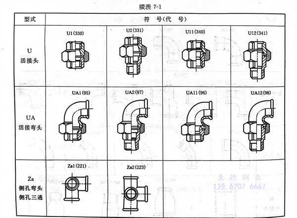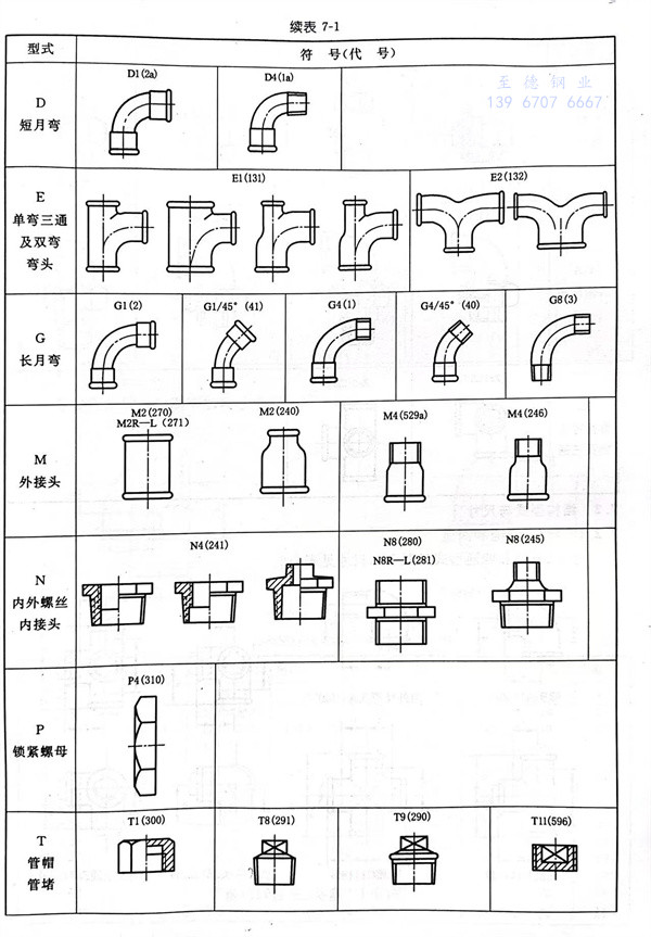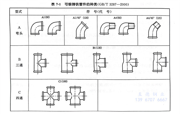 按結構型式劃分的(de)(de)可(ke)鍛鑄鐵管件種類見表7-1。表中的(de)(de)規定符(fu)號(hao)(代號(hao))與管路識(shi)別有關(guan),可(ke)以用于(yu)標(biao)記。