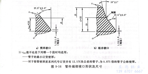 不銹鋼管(guan)(guan)件焊端坡口(kou)形狀及尺寸見(jian)圖 9-16,管(guan)(guan)件的焊接坡口(kou)和鈍(dun)邊見(jian)表 9-19 。