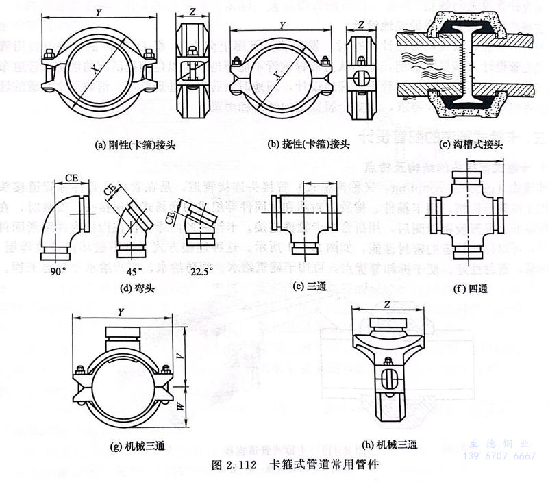 ⑦. 卡箍式管(guan)接頭采用的平口管(guan)件(jian)(jian)和附(fu)件(jian)(jian),其端部的溝槽(cao)應在管(guan)件(jian)(jian)生產(chan)廠加(jia)工成形,一般不得在施工現場切割開(kai)槽(cao)。常用的管(guan)件(jian)(jian),如圖(tu)2.112所(suo)示(shi)。