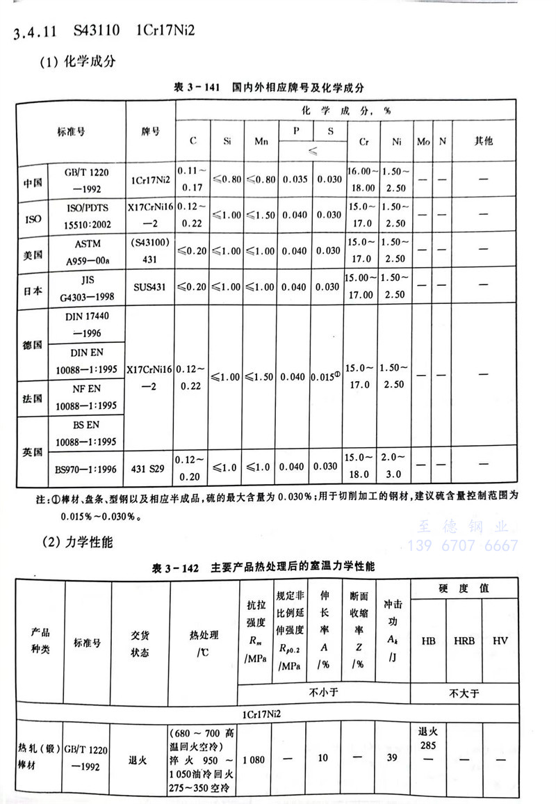 S43110 1Cr17Ni2 不銹鋼主要特性和用途