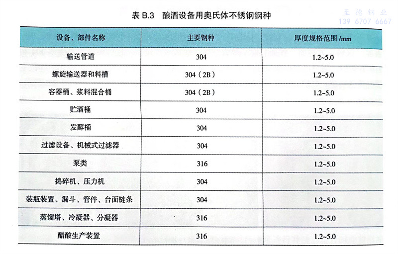葡(pu)萄酒等生產(chan)設(she)(she)(she)備(bei)也大量(liang)使用(yong)304和316不(bu)銹(xiu)(xiu)鋼,其中304不(bu)銹(xiu)(xiu)鋼主(zhu)要用(yong)于容器(qi)桶(tong)、料槽、貯(zhu)酒桶(tong)、發酵桶(tong)、過濾設(she)(she)(she)備(bei)、搗碎機(ji)(ji)、壓力(li)機(ji)(ji)、管件等;316不(bu)銹(xiu)(xiu)鋼主(zhu)要用(yong)于蒸餾(liu)塔、冷(leng)凝器(qi)、分凝器(qi)、酒醋生產(chan)裝(zhuang)置,釀(niang)酒設(she)(she)(she)備(bei)或配件用(yong)不(bu)銹(xiu)(xiu)鋼鋼種、主(zhu)要產(chan)品與生產(chan)企業如表B.3~表B.5所示。