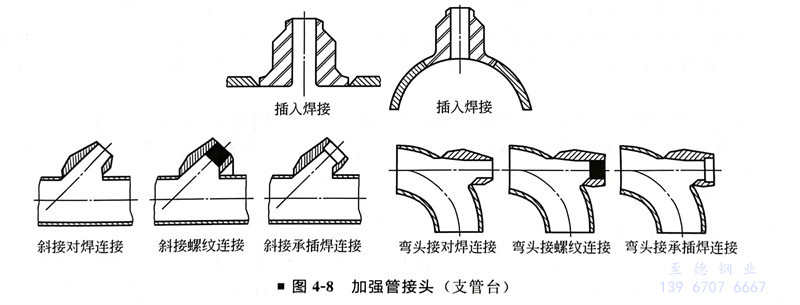 圖4-8所示(shi)的(de)(de)插入(ru)加(jia)(jia)(jia)強(qiang)(qiang)管(guan)(guan)接(jie)頭(tou)(tou)、斜(xie)接(jie)加(jia)(jia)(jia)強(qiang)(qiang)管(guan)(guan)接(jie)頭(tou)(tou)、彎頭(tou)(tou)加(jia)(jia)(jia)強(qiang)(qiang)管(guan)(guan)接(jie)頭(tou)(tou)以(yi)及Sweepolet加(jia)(jia)(jia)強(qiang)(qiang)管(guan)(guan)接(jie)頭(tou)(tou)與主管(guan)(guan)連接(jie)的(de)(de)焊(han)(han)縫(feng)可(ke)進(jin)行(xing)無(wu)損探傷檢(jian)查,焊(han)(han)接(jie)可(ke)靠,克服了“馬(ma)鞍焊(han)(han)”的(de)(de)角焊(han)(han)縫(feng)質量不宜保證、檢(jian)查困難的(de)(de)缺點,適用(yong)于(yu)火(huo)災危(wei)險分(fen)類(lei)為甲、乙類(lei)介(jie)質和劇(ju)毒介(jie)質的(de)(de)管(guan)(guan)道,是理想(xiang)的(de)(de)管(guan)(guan)接(jie)頭(tou)(tou)。目前,國內還沒有(you)制造廠生產這(zhe)幾種接(jie)頭(tou)(tou)。圖4-9所示(shi)是承插焊(han)(han)與螺紋連接(jie)的(de)(de)變徑管(guan)(guan)接(jie)頭(tou)(tou),用(yong)于(yu)DN50以(yi)下(xia)管(guan)(guan)道及其管(guan)(guan)配件的(de)(de)連接(jie)。