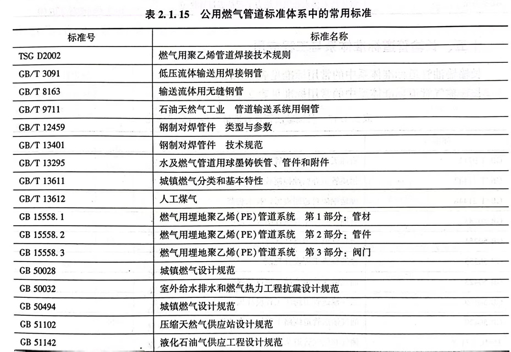公用燃氣管道標準體(ti)系中的常用標準見表2.1.15。