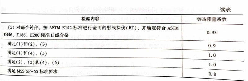 相對于軋制或鍛制的不銹鋼管道元件,鑄件缺陷相對較多,機械性能有所下降。在ASME B31.3中,為了衡量鑄件機械性能下降的程度,用鑄造質量系數來表示。鑄造質量系數同樣與無損探傷的檢驗數量有關。一般情況下,符合材料基本要求且根據MSS SP-55的規定已經過肉眼檢驗的靜態鑄件,可取其基本鑄造質量系數為0.8,對每一鑄件進行補充檢驗后可以按表3.1.5的要求提高。鑄件用作壓力管道及其元件的情況并不多,DN≥50閥門的閥體常采用鑄件,閥(fa)門閥體的強度設計一般由制造商進行,多數閥門標準已經給出了最小壁厚要求,實際管道設計中很少用到鑄造質量系數這個概念。ASME B31.3規定,用于劇烈操作條件下及工藝介質管道上的焊接和鑄造不銹鋼管件,其焊接質量系數和鑄造質量系數均不得低于0.9。在國內外管道設計標準規范中,有鑄造質量系數的規定。例如,GB 50316規定:如對鑄件進行補充檢測,質量系數可提高至表內規定的數值,但在任何情況下,質量系數不應超過1.00。