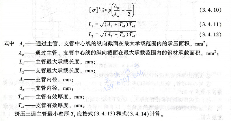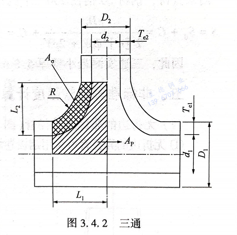 擠壓(ya)(ya)不(bu)銹鋼三通(tong)(tong)的(de)(de)壁厚計算(suan)應(ying)采用(yong)壓(ya)(ya)力面積法,計算(suan)時(shi),應(ying)控制三通(tong)(tong)承(cheng)載截面上(shang)的(de)(de)一次應(ying)力不(bu)超過材料(liao)在工作溫度(du)下的(de)(de)許用(yong)應(ying)力,許用(yong)應(ying)力應(ying)按式(shi)(3.4.10)計算(suan)。承(cheng)受內(nei)壓(ya)(ya)的(de)(de)三通(tong)(tong)外形見圖3.4.2承(cheng)載區(qu)的(de)(de)尺寸應(ying)按式(shi)(3.4.11)和式(shi)(3.4.12)計算(suan)。