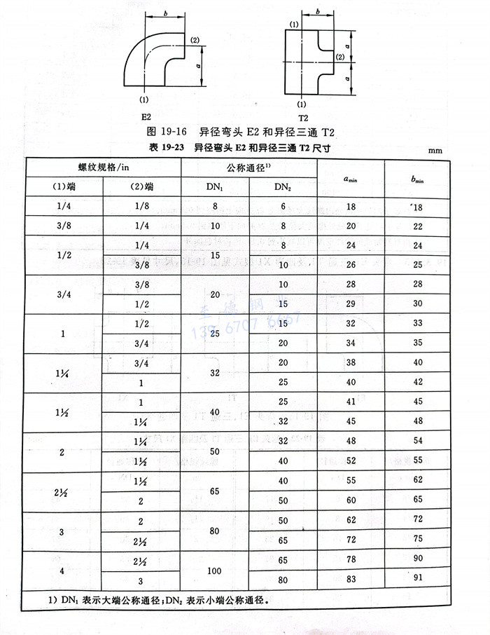 異(yi)徑彎頭 E2 和(he) 異(yi)徑三通 T2 型式見圖19-16,尺寸見表19-23。