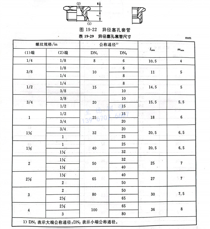 異(yi)徑塞(sai)孔(kong)(kong)管套可以有(you)六(liu)角(jiao)(jiao)(jiao)(jiao)形(xing)(xing)(xing)(xing)、八(ba)角(jiao)(jiao)(jiao)(jiao)形(xing)(xing)(xing)(xing)、十角(jiao)(jiao)(jiao)(jiao)形(xing)(xing)(xing)(xing)等(deng)種類。規格在1/2以下的(de)只有(you)六(liu)角(jiao)(jiao)(jiao)(jiao)形(xing)(xing)(xing)(xing)1種;規格為3/4~2的(de)有(you)六(liu)角(jiao)(jiao)(jiao)(jiao)形(xing)(xing)(xing)(xing)或八(ba)角(jiao)(jiao)(jiao)(jiao)形(xing)(xing)(xing)(xing)2種;規格為22~4的(de)有(you)六(liu)角(jiao)(jiao)(jiao)(jiao)形(xing)(xing)(xing)(xing)、八(ba)角(jiao)(jiao)(jiao)(jiao)形(xing)(xing)(xing)(xing)或十角(jiao)(jiao)(jiao)(jiao)形(xing)(xing)(xing)(xing)3種。異(yi)徑塞(sai)孔(kong)(kong)管套B1型式見圖(tu)19-22,尺寸見表19-29。