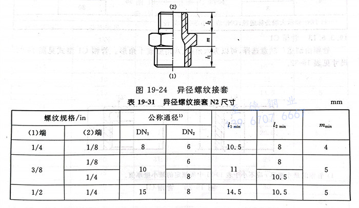 六(liu)(liu)角(jiao)(jiao)(jiao)(jiao)(jiao)頭螺紋接(jie)套(tao)可以有(you)六(liu)(liu)角(jiao)(jiao)(jiao)(jiao)(jiao)形(xing)、八角(jiao)(jiao)(jiao)(jiao)(jiao)形(xing)、十(shi)角(jiao)(jiao)(jiao)(jiao)(jiao)形(xing)等種(zhong)(zhong)類。規格(ge)在1/2以下(xia)的(de)只有(you)六(liu)(liu)角(jiao)(jiao)(jiao)(jiao)(jiao)形(xing)1種(zhong)(zhong);規格(ge)為3/4~2的(de)有(you)六(liu)(liu)角(jiao)(jiao)(jiao)(jiao)(jiao)形(xing)或(huo)(huo)八角(jiao)(jiao)(jiao)(jiao)(jiao)形(xing)2種(zhong)(zhong);規格(ge)為2/2~4的(de)有(you)六(liu)(liu)角(jiao)(jiao)(jiao)(jiao)(jiao)形(xing)、八角(jiao)(jiao)(jiao)(jiao)(jiao)形(xing)或(huo)(huo)十(shi)角(jiao)(jiao)(jiao)(jiao)(jiao)形(xing)3種(zhong)(zhong),六(liu)(liu)角(jiao)(jiao)(jiao)(jiao)(jiao)形(xing)螺紋接(jie)套(tao)型式(shi) N1 見圖19-23,尺寸見表19-30。