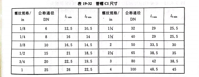 管帽由制造廠(chang)隨意選(xuan)擇,可以為(wei)六角(jiao)(jiao)形、八角(jiao)(jiao)形或十角(jiao)(jiao)形。管帽C1型式見(jian)圖19-25,尺寸見(jian)表19-32。
