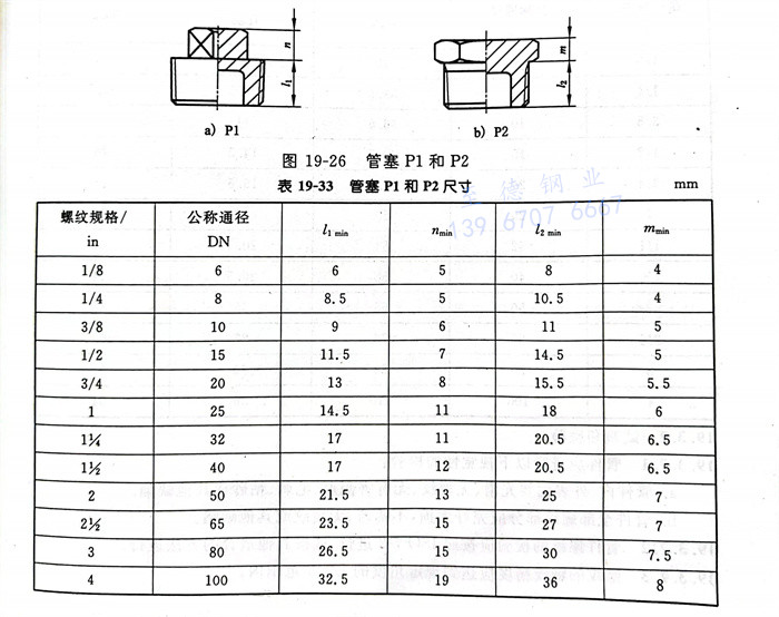 管塞由制造廠隨意選擇,可(ke)(ke)以為實(shi)心的(de)或空心的(de)。管塞P2可(ke)(ke)以為六(liu)角(jiao)(jiao)頭形(xing)、八(ba)(ba)(ba)角(jiao)(jiao)頭形(xing)、十角(jiao)(jiao)頭形(xing)等種(zhong)(zhong)類。規格在1/2以下的(de)只有六(liu)角(jiao)(jiao)形(xing)1種(zhong)(zhong);規格為3/4~2的(de)有六(liu)角(jiao)(jiao)形(xing)或八(ba)(ba)(ba)角(jiao)(jiao)形(xing)2種(zhong)(zhong);規格為2%~4的(de)有六(liu)角(jiao)(jiao)形(xing)、八(ba)(ba)(ba)角(jiao)(jiao)形(xing)或十角(jiao)(jiao)形(xing)3種(zhong)(zhong)。管塞P1和P2的(de)型式見圖19-26,尺寸見表19-33。