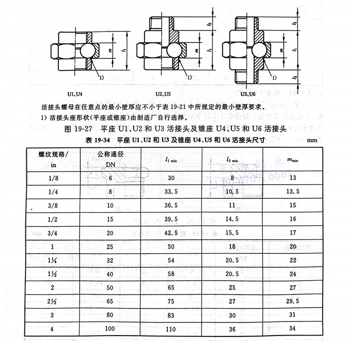 平座U1、U2和U3活(huo)接頭(tou)及錐座U4、U5和U6活(huo)接頭(tou)型式見(jian)圖19-27,尺寸見(jian)表19-34。
