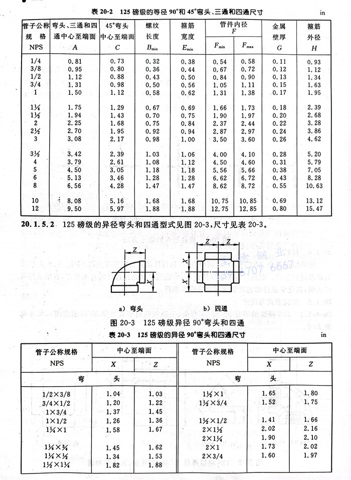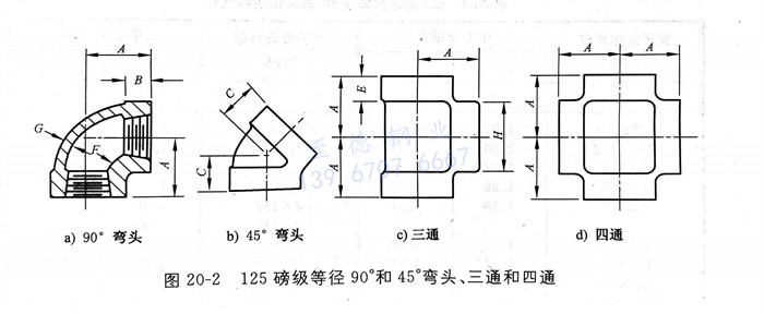 125磅級的等徑90°和45°彎頭、三(san)通和四通型(xing)式見圖20-2(示意圖),尺寸(cun)見表(biao)20-2。