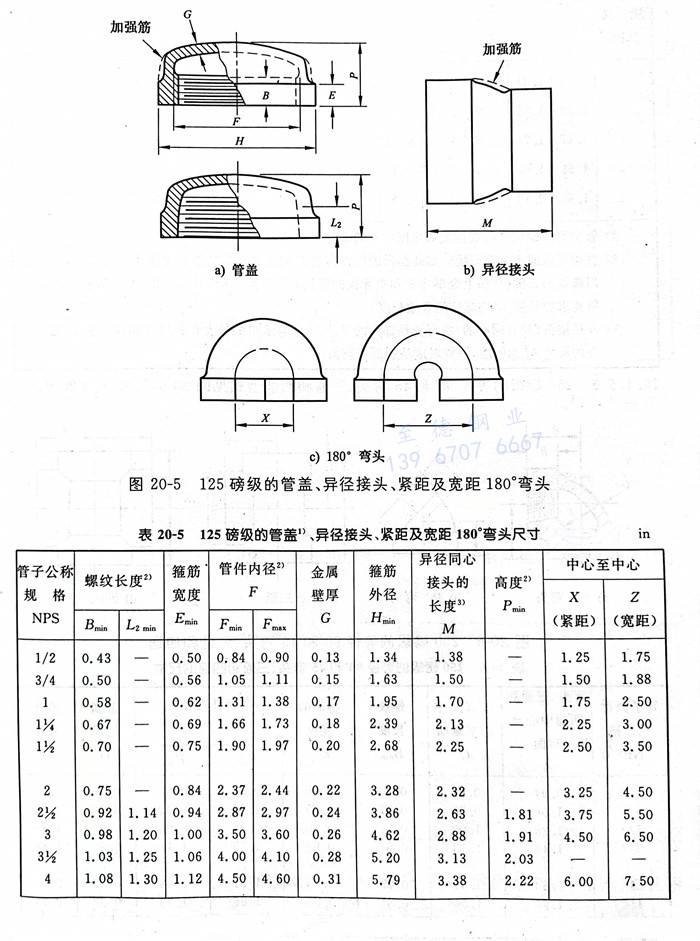 125磅(bang)級的(de)管蓋、異徑接頭(tou)、緊距及(ji)寬距 180°彎(wan)頭(tou)型(xing)式見圖20-5(示(shi)意(yi)圖),尺寸見表(biao)20-5。