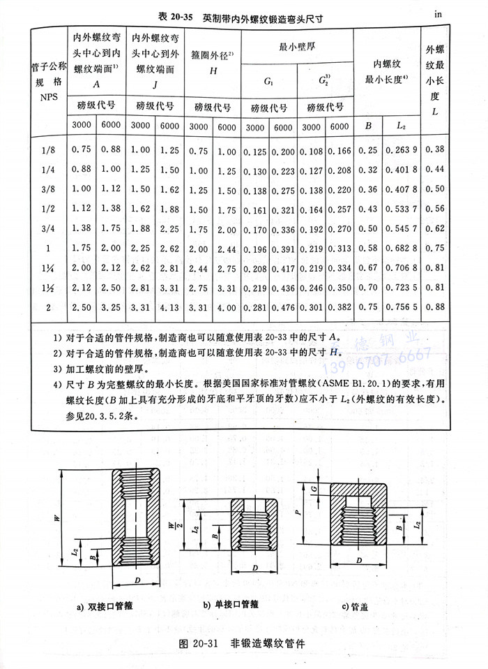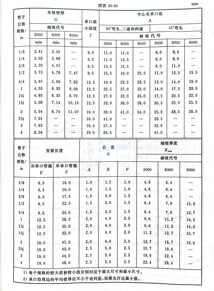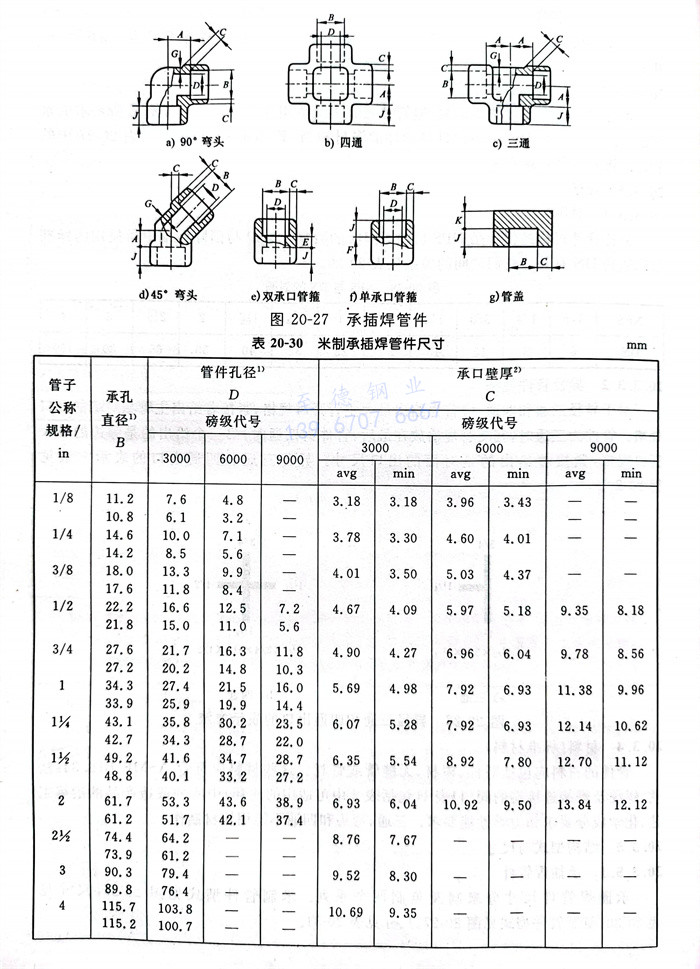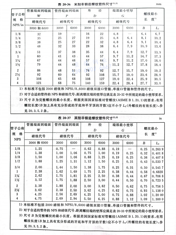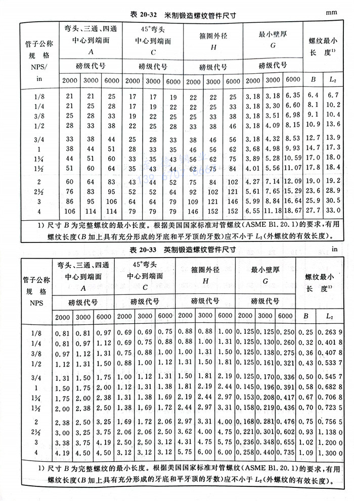 ASME B16.11-2005標準適用于表20-30~表20-39所示(shi)的承插(cha)焊式(shi)和螺紋連接式(shi)兩(liang)種(zhong)鍛(duan)制管件的壓(ya)力-溫度(du)等級、材料、尺(chi)寸、公(gong)差(cha)和標志(zhi)。