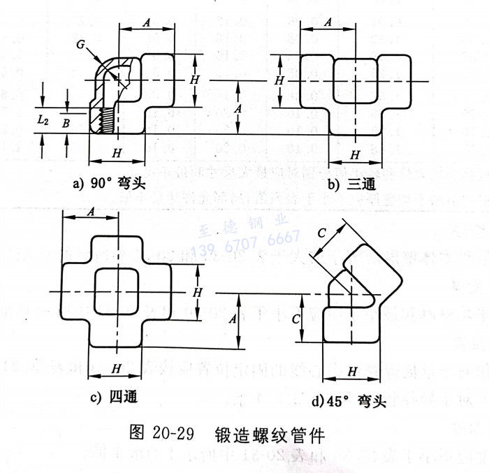 米制鍛(duan)造螺紋管(guan)件的型式(shi)見(jian)圖20-29,尺寸見(jian)表20-32;英制鍛(duan)造螺紋管(guan)件的型式(shi)見(jian)圖20-29,尺寸見(jian)20-33。