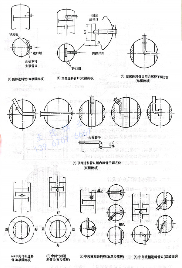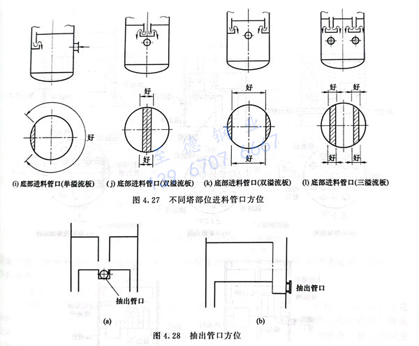 b. 中(zhong)間進料。氣相進料管口方(fang)(fang)位(wei)見圖4.27(e)、(f)。液相進料管口方(fang)(fang)位(wei)見圖4.27(g)、(h)。