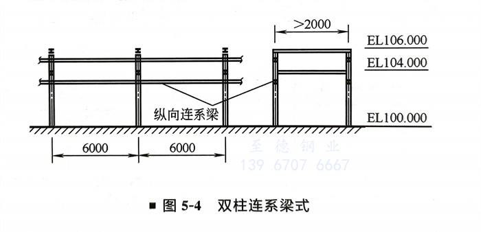 ②. 雙柱連系梁(liang)(liang)式:寬度在2m以(yi)上,分單層(ceng)與雙層(ceng),根據需要也(ye)可以(yi)多層(ceng),如果管(guan)廊兩側進(jin)出管(guan)線多時,一般在該層(ceng)橫梁(liang)(liang)頂部以(yi)下(xia)750~1250mm處加縱向(xiang)連系梁(liang)(liang),以(yi)支撐側向(xiang)進(jin)出管(guan)線,如圖5-4所示。