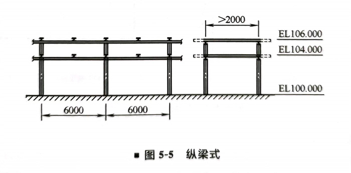 ③. 縱梁(liang)式(shi)(shi):分單柱和雙(shuang)柱結構(gou),雙(shuang)柱縱梁(liang)式(shi)(shi)一般為多(duo)層結構(gou),這種管(guan)(guan)廊的特點是管(guan)(guan)廊之間(jian)設有縱梁(liang),可以根據(ju)管(guan)(guan)道允許跨(kua)距(ju)在縱梁(liang)間(jian)加支撐用次(ci)梁(liang),如圖5-5所示。