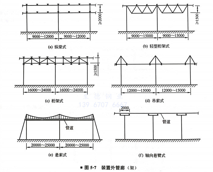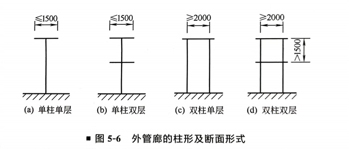 裝置外(wai)管(guan)廊一般(ban)分(fen)(fen)為單(dan)柱(zhu)(T形)式和雙(shuang)(shuang)柱(zhu)(II形)式。單(dan)柱(zhu)管(guan)廊一般(ban)為單(dan)層(ceng),必要(yao)時也(ye)可(ke)采用(yong)雙(shuang)(shuang)層(ceng)。雙(shuang)(shuang)柱(zhu)管(guan)廊根據需要(yao)可(ke)分(fen)(fen)為單(dan)層(ceng)、雙(shuang)(shuang)層(ceng)及多層(ceng)。如(ru)圖5-6所示(shi)。
