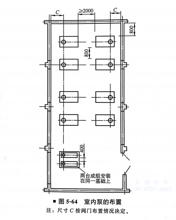 ③. 泵布置(zhi)在室(shi)內(nei)時,一般不(bu)考(kao)慮機動檢修車輛的通(tong)行要求。泵端(duan)或泵側與墻之間的凈距不(bu)宜(yi)小(xiao)于1.0m,兩排泵凈距不(bu)應小(xiao)于2m。
