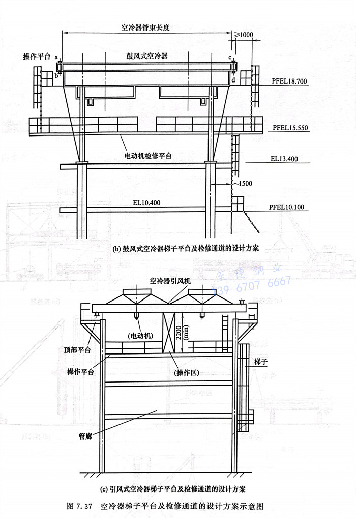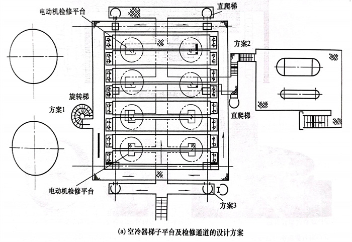 空(kong)冷器(qi)管(guan)束(shu)兩端管(guan)箱和傳動機械(xie)處(chu)應設置(zhi)(zhi)平臺(tai)。布(bu)置(zhi)(zhi)空(kong)冷器(qi)的(de)構架或主(zhu)管(guan)廊(lang)的(de)一側地(di)面上應留(liu)有(you)必要的(de)檢修(xiu)場地(di)和通道(dao)。如圖(tu)7.37所示,空(kong)冷器(qi)成排布(bu)置(zhi)(zhi)在管(guan)廊(lang)頂部時,梯子平臺(tai)的(de)設置(zhi)(zhi)可采用以下3種(zhong)方案。
