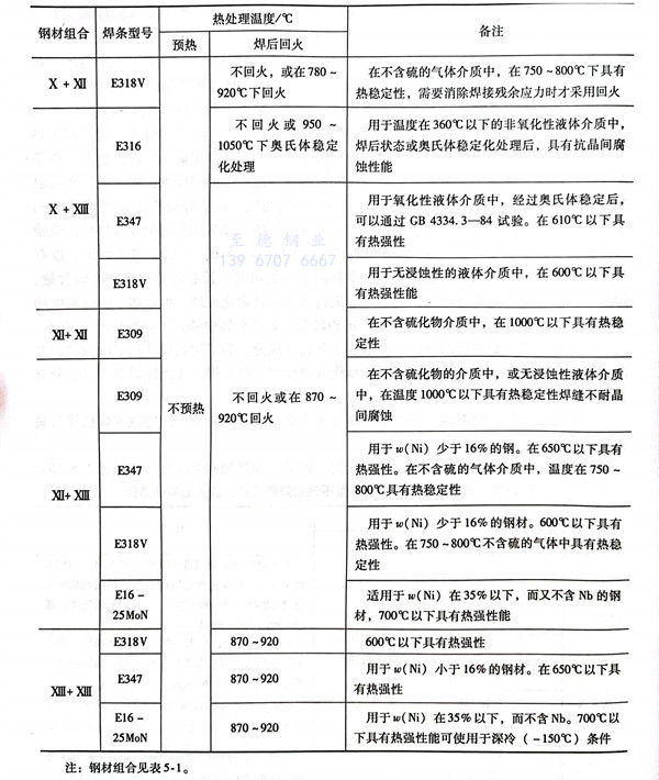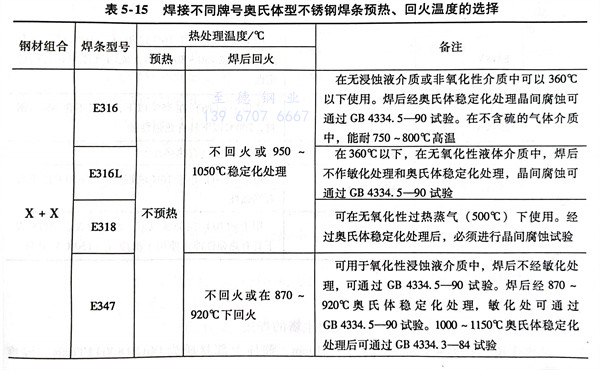有關不(bu)同(tong)牌號(hao)的奧氏體型不(bu)銹鋼管焊(han)接時,焊(han)條、預熱和回(hui)火溫度的選擇見表5-15。