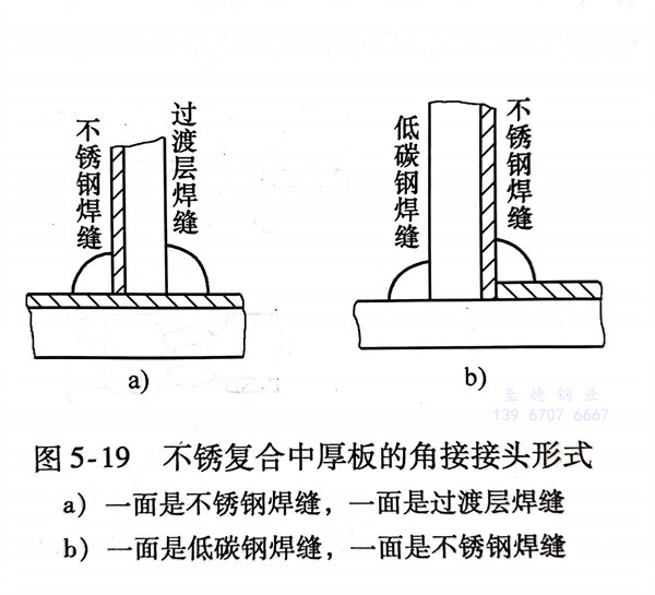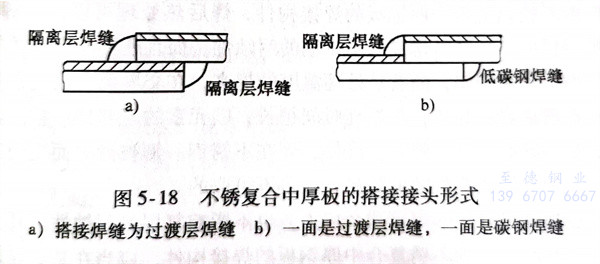 不(bu)銹(xiu)鋼復合中厚鋼板的搭接(jie)(jie)(jie)(jie)接(jie)(jie)(jie)(jie)頭和(he)角接(jie)(jie)(jie)(jie)接(jie)(jie)(jie)(jie)頭形式如圖5-18和(he)圖5-19所(suo)(suo)示。在待焊(han)(han)(han)區中碳鋼和(he)不(bu)銹(xiu)鋼的共(gong)存(cun)部位,要選(xuan)用(yong)(yong)過渡層的焊(han)(han)(han)接(jie)(jie)(jie)(jie)材料。待焊(han)(han)(han)處都(dou)是(shi)碳鋼時(shi)(shi),可(ke)以按基層所(suo)(suo)選(xuan)用(yong)(yong)的焊(han)(han)(han)接(jie)(jie)(jie)(jie)材料進(jin)行(xing)施焊(han)(han)(han);同樣,待焊(han)(han)(han)區都(dou)是(shi)不(bu)銹(xiu)鋼材料時(shi)(shi),理應(ying)選(xuan)用(yong)(yong)復層的焊(han)(han)(han)接(jie)(jie)(jie)(jie)材料,但考慮到(dao)焊(han)(han)(han)接(jie)(jie)(jie)(jie)熔池的深度,可(ke)能將基層熔化,此時(shi)(shi)第一層焊(han)(han)(han)縫仍要選(xuan)用(yong)(yong)過渡層的焊(han)(han)(han)接(jie)(jie)(jie)(jie)材料,切(qie)不(bu)可(ke)忽視。