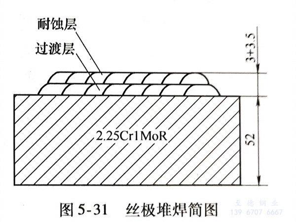 母(mu)材選用(yong)(yong)規格為400mm×300mm×52mm的2 Cr1Mo鋼板(ban)(ban)。試板(ban)(ban)整(zheng)體預熱至(zhi)100~150℃,采用(yong)(yong)雙層(ceng)絲(si)極(ji)堆(dui)焊(han),過渡層(ceng)選用(yong)(yong)H309SL焊(han)絲(si)和焊(han)劑SJ661;耐蝕(shi)層(ceng)選用(yong)(yong)H347SL焊(han)絲(si)和SJ667焊(han)劑。堆(dui)焊(han)參數見(jian)表5-64,堆(dui)焊(han)簡圖(tu)如(ru)圖(tu)5-31所示。