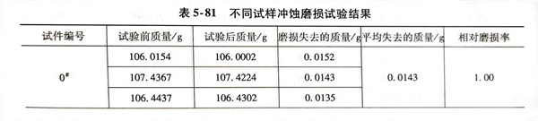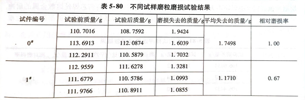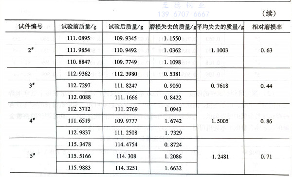 采用MLS-225型濕式橡膠(jiao)輪磨粒磨損(sun)(sun)試(shi)驗機(ji)。材(cai)(cai)(cai)料(liao)的耐(nai)(nai)磨性(xing)能用磨損(sun)(sun)失(shi)(shi)去質量(liang)來衡量(liang),算(suan)出磨損(sun)(sun)前后試(shi)件的平均質量(liang)差。與(yu)試(shi)驗時用水輪機(ji)母材(cai)(cai)(cai)相比。對(dui)比件失(shi)(shi)去的質量(liang)與(yu)測量(liang)件失(shi)(shi)去的質量(liang)之比來衡量(liang)該堆焊層的相對(dui)耐(nai)(nai)磨性(xing)。相對(dui)磨損(sun)(sun)率=對(dui)比材(cai)(cai)(cai)料(liao)的磨損(sun)(sun)量(liang)/0#試(shi)樣材(cai)(cai)(cai)料(liao)的磨損(sun)(sun)量(liang)。試(shi)驗結(jie)果(guo)見表5-80。