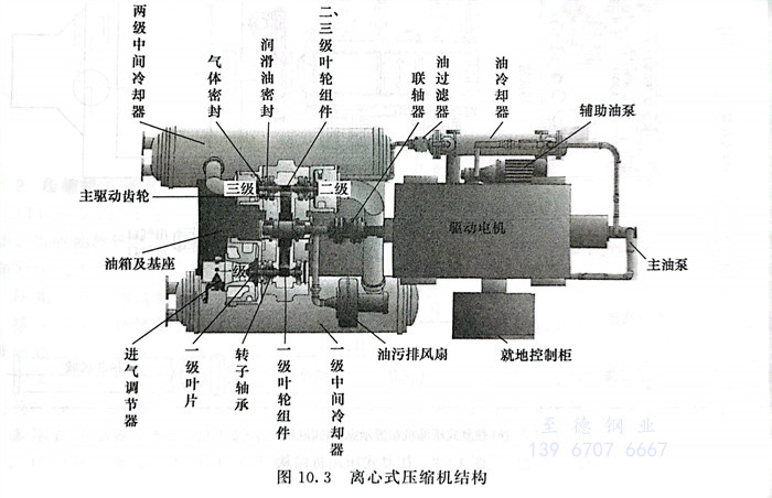 離心式壓縮(suo)機主(zhu)(zhu)要由轉(zhuan)(zhuan)子(zi)和定(ding)子(zi)兩部分組成(cheng),轉(zhuan)(zhuan)子(zi)包括葉(xie)(xie)輪和軸,葉(xie)(xie)輪上(shang)有(you)葉(xie)(xie)片(pian)、平衡盤和一部分軸封;定(ding)子(zi)的主(zhu)(zhu)體是氣(qi)缸,還有(you)擴(kuo)壓器(qi)、彎道、回(hui)流器(qi)、進氣(qi)管、排(pai)氣(qi)管等裝(zhuang)置,見圖10.3。