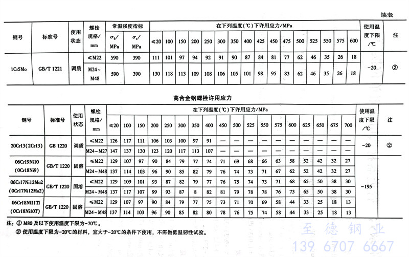 常用螺栓使用溫度限制和許用應力參照表