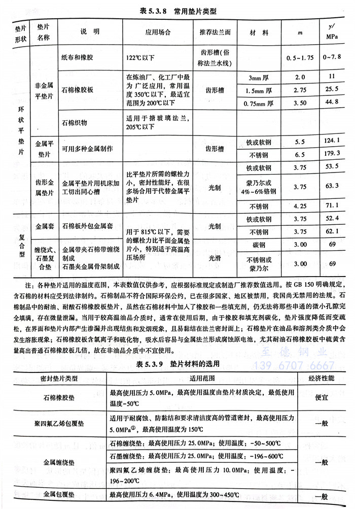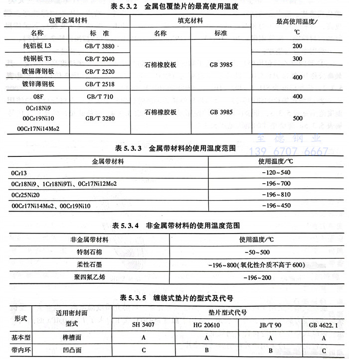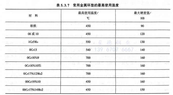 常用(yong)金屬(shu)環(huan)墊的最高(gao)使用(yong)溫(wen)度見表(biao)(biao)(biao)5.3.7。常用(yong)墊片類型見表(biao)(biao)(biao)5.3.8,墊片材料的選用(yong)見表(biao)(biao)(biao)5.3.9。