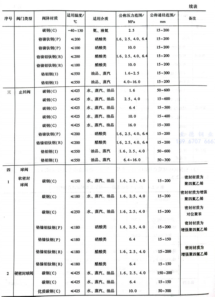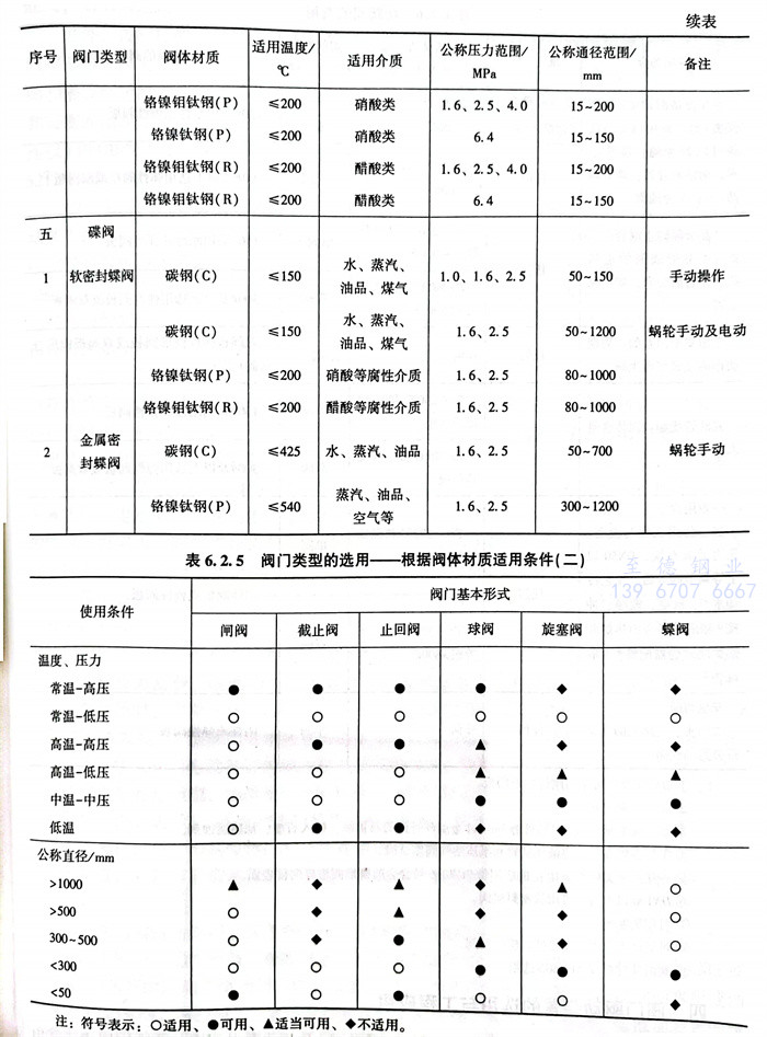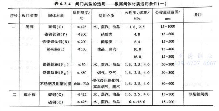 根據閥(fa)體(ti)材質適(shi)用的溫度(du)、介質、壓力、通徑范圍等條件對閥(fa)門類型(xing)的選用見表(biao)6.2.4和表(biao)6.2.5。
