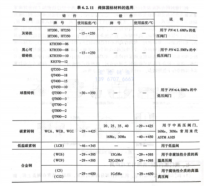 根據零件的結構尺寸、形狀決定采用鍛造或鑄造工藝。石油化工企業使用的通用閥門選用材料應執行行業標準SH/T 3064《石油化工鋼制通用閥門選用、檢驗及驗收》。國內標準閥門用材料的使用溫度范圍見表6.2.11。用于輸送介質溫度為-20~425℃碳素鋼制閥門的主要零件材料見表6.2.12。用于輸送介質溫度低于或等于550℃的合金鋼制閥門的主要零件材料見表6.2.13。用于輸送溫度低于或等于200℃的硝酸、醋酸的不銹鋼制閥門主要零件材料見表6.2.14。