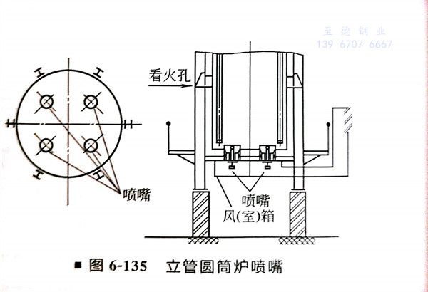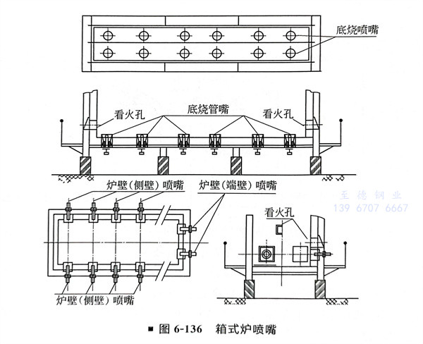 ②. 燃燒器一般設置在爐(lu)底及(ji)側壁(底燒噴嘴(zui)或側燒噴嘴(zui))。噴嘴(zui)數量及(ji)安裝位置取決于加(jia)熱(re)爐(lu)的熱(re)負荷及(ji)爐(lu)體構造(圖(tu)6-135、圖(tu)6-136)。