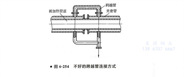 ③. 根據(ju)加熱(re)介質(zhi)的(de)不同,合理(li)選用(yong)跨越管(guan)的(de)連接及(ji)密(mi)封形式。圖(tu)6-254所示為不太好的(de)夾套(tao)跨越管(guan),特別是水平(ping)大(da)口徑管(guan)道(dao)上易造成管(guan)道(dao)頂底伴熱(re)不均勻(yun)。
