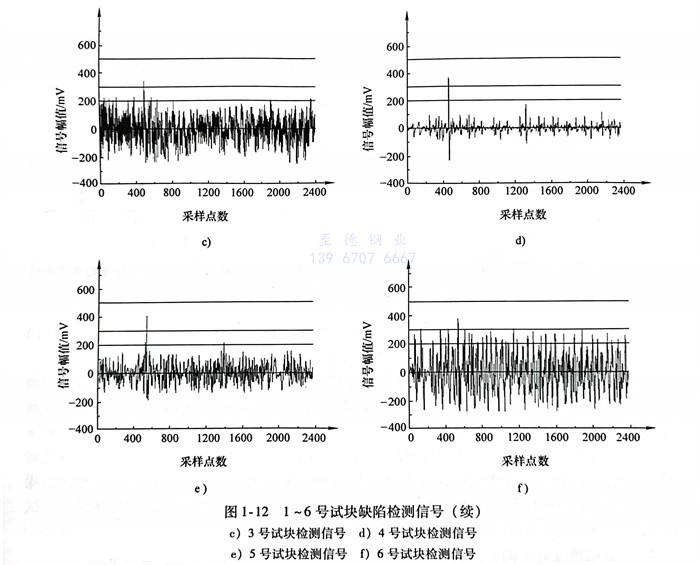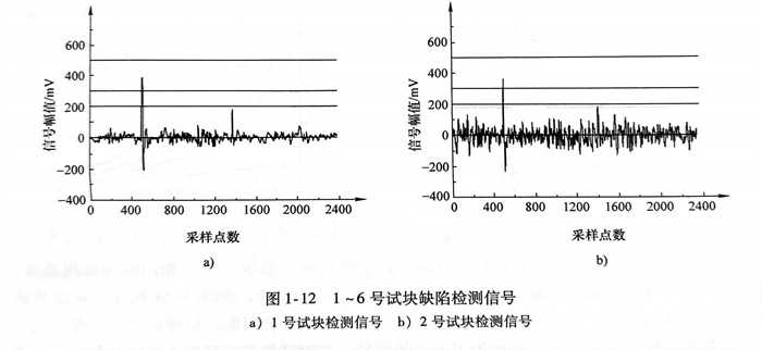 保持(chi)試驗條(tiao)件(jian)不(bu)變,探(tan)頭(tou)以(yi)相同(tong)速(su)度掃查所有(you)試塊(kuai),對不(bu)同(tong)深度的裂紋(wen)進行漏磁檢測。各(ge)試塊(kuai)得到的缺陷檢測信(xin)號如圖1-12所示。