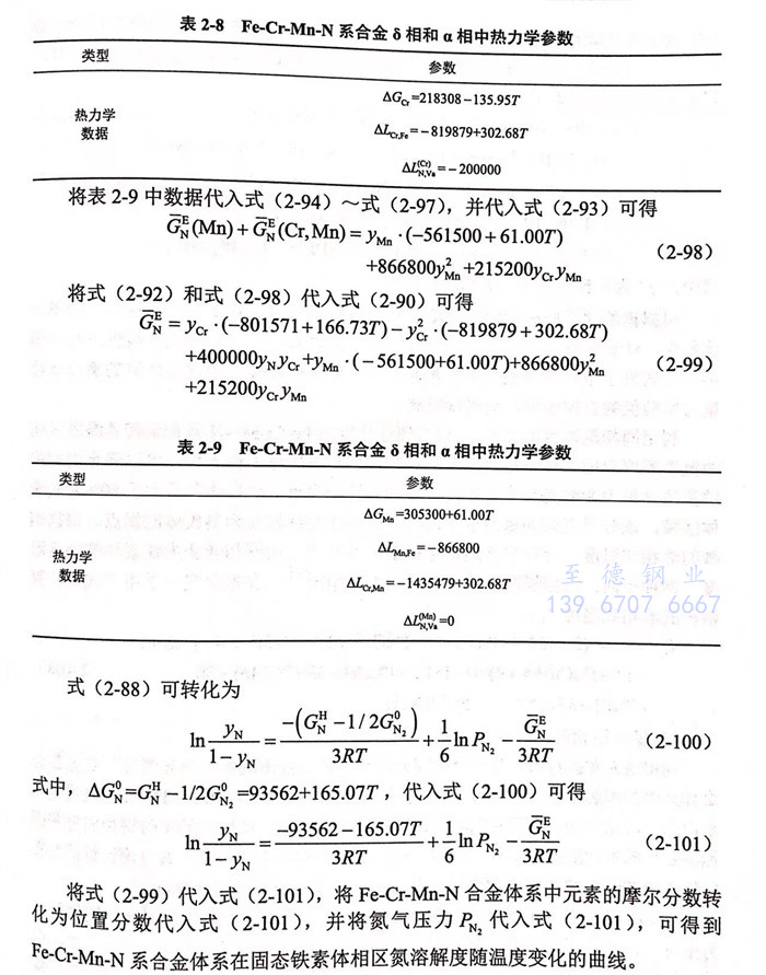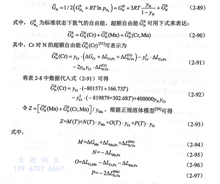 表(biao)2-11給出了1000~1200℃范圍內(nei),N與(yu)合(he)金元素Cr、Mn的活度(du)相互(hu)作用(yong)(yong)系數(shu)和溫度(du)之間的關系。根據Wagner模型,超額吉布斯自由能可以用(yong)(yong)活度(du)相互(hu)作用(yong)(yong)系數(shu)表(biao)示為