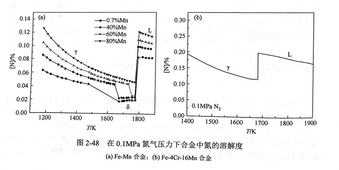一般而言,不銹鋼熔體在凝固過程中首先生成δ-Fe相,而氮在δ-Fe中的溶解度遠低于在液相和奧氏體相中的溶解度(如圖2-42所示,容易使鋼中的氮析出并形成氮氣孔。因此,探究影響固相中氮溶解度的因素,并建立合理的固相溶解度模型,對高氮不(bu)銹鋼(gang)的成分設計和凝固過程的控制具有重要意義。