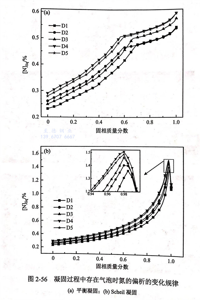 平衡凝固時(shi),19Cr14Mn0.9N含氮(dan)奧氏(shi)(shi)體(ti)不銹鋼(gang)殘余液相(xiang)中(zhong)氮(dan)偏析(xi)與體(ti)系(xi)(xi)氮(dan)溶(rong)(rong)解度的(de)(de)差值如圖2-59所(suo)示。凝固初期鐵素體(ti)阱(ferrite trap)的(de)(de)形(xing)成,導致氮(dan)溶(rong)(rong)解度的(de)(de)降低(di),進而使氮(dan)偏析(xi)與體(ti)系(xi)(xi)氮(dan)溶(rong)(rong)解度差值呈(cheng)現出略微增大的(de)(de)趨勢(shi)。但(dan)在(zai)后(hou)續凝固過程(cheng)中(zhong),隨(sui)著鐵素體(ti)阱的(de)(de)消(xiao)失以及(ji)富氮(dan)奧氏(shi)(shi)體(ti)相(xiang)的(de)(de)不斷形(xing)成,差值減小;在(zai)整個凝固過程(cheng)中(zhong)差值始(shi)終較(jiao)小,且變化幅度較(jiao)窄。對于(yu)19Cr14Mn0.9N 含氮(dan)奧氏(shi)(shi)體(ti)不銹鋼(gang),液相(xiang)中(zhong)氮(dan)氣(qi)泡的(de)(de)形(xing)成趨勢(shi)較(jiao)小,難以在(zai)鑄錠內形(xing)成獨立內壁光(guang)滑的(de)(de)規則氮(dan)氣(qi)孔。