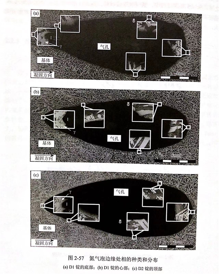 氮(dan)(dan)氣(qi)孔(kong)(kong)沿徑向生長,生長方向與凝固方向一(yi)致,那么氮(dan)(dan)氣(qi)孔(kong)(kong)初始(shi)形(xing)(xing)成(cheng)位(wei)置靠(kao)近鑄錠(ding)邊部(bu),且氮(dan)(dan)氣(qi)泡初始(shi)位(wei)置邊緣全由奧(ao)氏體(ti)相γ構成(cheng)(圖2-57中I區),與圖2-55描述相符。隨著氮(dan)(dan)氣(qi)孔(kong)(kong)被拉長,鐵素(su)體(ti)相和奧(ao)氏體(ti)相以體(ti)積分數比約為0.92的(de)(de)關(guan)系交替在氮(dan)(dan)氣(qi)泡周圍形(xing)(xing)成(cheng),直到氮(dan)(dan)氣(qi)孔(kong)(kong)閉合。凝固結(jie)束(shu)后,氮(dan)(dan)氣(qi)孔(kong)(kong)的(de)(de)宏(hong)觀形(xing)(xing)貌類(lei)似于橢(tuo)圓形(xing)(xing),與Wei等的(de)(de)研究結(jie)果一(yi)致