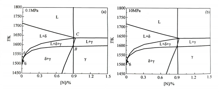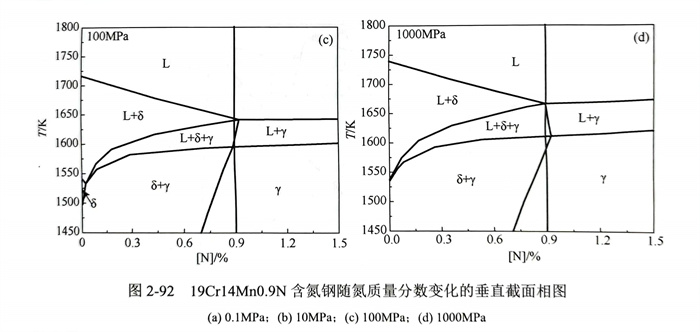 19Cr14Mn0.9N含(han)氮鋼凝固過(guo)程中(zhong)鐵素(su)體(ti)相(xiang)(xiang)8和(he)奧(ao)氏體(ti)相(xiang)(xiang)γ的單(dan)相(xiang)(xiang)區(qu)(qu)隨壓(ya)(ya)力(li)的變化規律如(ru)圖(tu)2-95所(suo)示(shi)(shi)。當壓(ya)(ya)力(li)從0.1MPa增(zeng)加(jia)(jia)到(dao)100MPa時(shi),δ/(δ+L)相(xiang)(xiang)邊界(jie)變化較(jiao)小,8/(δ+γ)相(xiang)(xiang)邊界(jie)整體(ti)向(xiang)(xiang)高(gao)溫端移(yi)動,鐵素(su)體(ti)相(xiang)(xiang)8形成(cheng)區(qu)(qu)域逐漸(jian)減小;當壓(ya)(ya)力(li)進一步增(zeng)加(jia)(jia)到(dao)1000MPa時(shi),鐵素(su)體(ti)相(xiang)(xiang)8單(dan)相(xiang)(xiang)區(qu)(qu)幾乎從隨氮質量分(fen)數變化的垂(chui)直截面(mian)相(xiang)(xiang)圖(tu)中(zhong)消失,如(ru)圖(tu)2-95(a)所(suo)示(shi)(shi),即增(zeng)加(jia)(jia)壓(ya)(ya)力(li)有助于(yu)(yu)鐵素(su)體(ti)相(xiang)(xiang)δ的消失[138].而(er)對于(yu)(yu)奧(ao)氏體(ti)相(xiang)(xiang)γ,隨著(zhu)壓(ya)(ya)力(li)的增(zeng)加(jia)(jia),γ/(y+L)相(xiang)(xiang)邊界(jie)向(xiang)(xiang)高(gao)溫段(duan)移(yi)動,γ/(δ+γ)相(xiang)(xiang)邊界(jie)整體(ti)向(xiang)(xiang)高(gao)氮區(qu)(qu)移(yi)動,整個(ge)區(qu)(qu)域呈增(zeng)大趨(qu)勢,如(ru)圖(tu)2-95(b)所(suo)示(shi)(shi)。