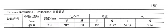 下面(mian)對不同厚度(du)鋼(gang)板中不同深度(du)的機加工(gong)不通孔(kong)進行檢(jian)測試驗,其中8.0mm厚和17.2mm厚的鋼(gang)板正(zheng)、反(fan)面(mian)檢(jian)測不通孔(kong)缺陷(xian)信號如圖4-17和圖4-18所示,將(jiang)各人(ren)工(gong)缺陷(xian)的試驗數據(ju)及評判指標計算列入表4-5。