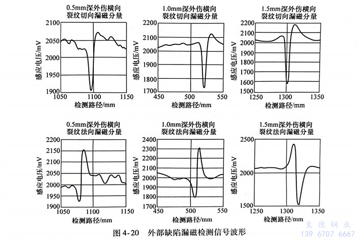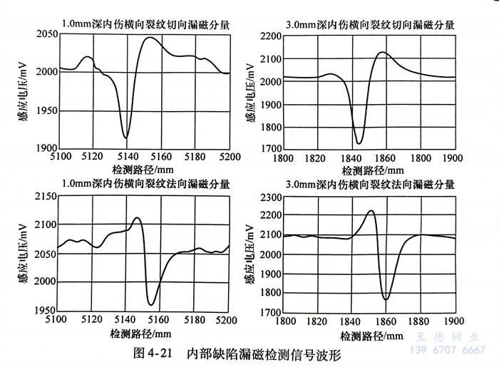在(zai)不(bu)銹鋼管(guan)(guan)內、外表面上(shang)用電火花方法加工(gong)斜(xie)向刻槽(cao)(cao),刻槽(cao)(cao)相對于管(guan)(guan)材軸向方向傾斜(xie)45°,深度分別(bie)為(wei)1.0mm(外部(bu)缺陷(xian)),3.0mm(內部(bu)缺陷(xian)),寬度均為(wei)0.5mm;鋼管(guan)(guan)直線前進,磁(ci)化器仍然選(xuan)用直流磁(ci)化線圈,斜(xie)向缺陷(xian)的檢測信號及二階(jie)差(cha)分輸出如圖4-24所示。