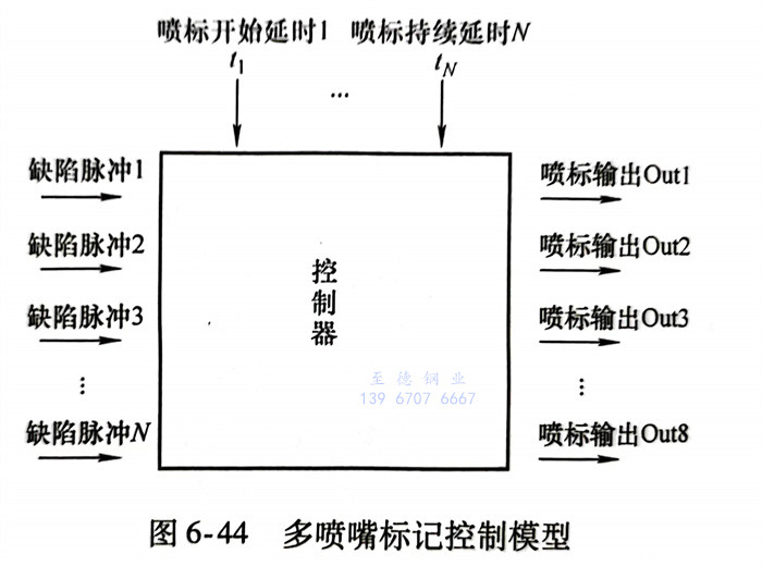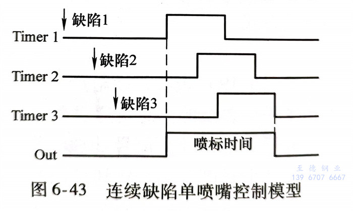 在如圖(tu)6-43所示過(guo)程中,一個標記(ji)(ji)周(zhou)期(qi)內連(lian)續出(chu)現(xian)三(san)(san)個缺陷,分(fen)(fen)別(bie)(bie)由三(san)(san)個定時器(qi)進行(xing)上升沿捕獲(huo),然(ran)(ran)后(hou)分(fen)(fen)別(bie)(bie)延時,共同輸(shu)出(chu),因(yin)此三(san)(san)個連(lian)續缺陷點的(de)標記(ji)(ji)效果(guo)為一條(tiao)連(lian)續的(de)標記(ji)(ji)線,而不(bu)(bu)會出(chu)現(xian)遺(yi)漏標記(ji)(ji)的(de)情況(kuang)。然(ran)(ran)而,不(bu)(bu)同位置的(de)缺陷產生了一條(tiao)連(lian)續標記(ji)(ji)線,雖然(ran)(ran)沒有出(chu)現(xian)遺(yi)漏,但是(shi)標記(ji)(ji)分(fen)(fen)辨率降低了,遺(yi)失了精(jing)確的(de)對(dui)應關(guan)系(xi)。為提高標記(ji)(ji)精(jing)確度,將(jiang)條(tiao)狀(zhuang)探頭內部(bu)檢測(ce)元件(jian)獨(du)立分(fen)(fen)類,分(fen)(fen)別(bie)(bie)設置不(bu)(bu)同的(de)延時周(zhou)期(qi),并采用多噴嘴(zui)(zui)進行(xing)標記(ji)(ji),多噴嘴(zui)(zui)標記(ji)(ji)控制模(mo)型如圖(tu)6-44所示。