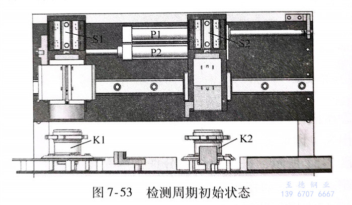 每(mei)個檢測(ce)周(zhou)期(qi)開始(shi)時,氣缸P1和P2處(chu)于(yu)伸展狀(zhuang)(zhuang)態,氣缸S1和S2處(chu)于(yu)收縮(suo)狀(zhuang)(zhuang)態,檢測(ce)平臺(tai)的上(shang)(shang)料工位放置(zhi)(zhi)著剛剛被填充進來的待檢測(ce)軸(zhou)承(cheng)(cheng)K1,分選工位上(shang)(shang)放置(zhi)(zhi)著上(shang)(shang)一(yi)(yi)周(zhou)期(qi)已經完成檢測(ce)的軸(zhou)承(cheng)(cheng)K2,這里假設軸(zhou)承(cheng)(cheng)K1帶有可(ke)被檢測(ce)到的缺(que)陷(xian),軸(zhou)承(cheng)(cheng)K2沒(mei)有缺(que)陷(xian),因而K2在上(shang)(shang)一(yi)(yi)檢測(ce)周(zhou)期(qi)結(jie)束后沒(mei)有被分選裝置(zhi)(zhi)推(tui)入(ru)回(hui)收箱。檢測(ce)周(zhou)期(qi)初始(shi)狀(zhuang)(zhuang)態如圖7-53所(suo)示。