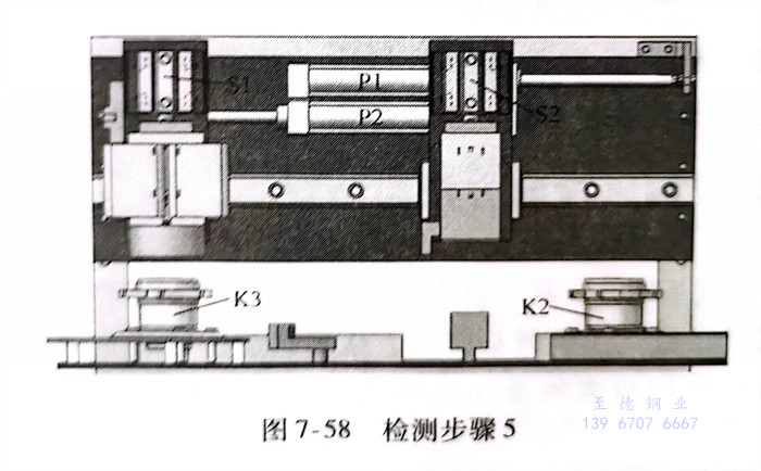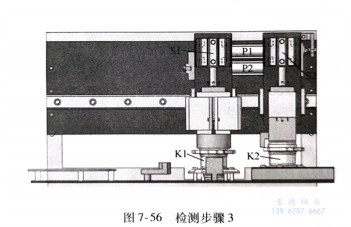 b. 檢測步驟2(圖7-55)氣缸(gang)S1收縮(suo),軸(zhou)承(cheng)K1被抬起。氣缸(gang)P2收縮(suo),軸(zhou)承(cheng)K1被傳(chuan)送至掃(sao)查(cha)工位(wei)。掃(sao)查(cha)電動機(ji)通電開始掃(sao)查(cha),漏(lou)磁檢測軟件啟動,采集數據并做出有無缺陷的(de)判斷(這里(li)假設K1有缺陷,因此系統將其判定為(wei)次(ci)品)。氣缸(gang)S2伸展,退磁器(qi)下降與上一周期檢測完(wan)成的(de)軸(zhou)承(cheng)K2接觸,退磁器(qi)通電,對K2執行退磁工序。